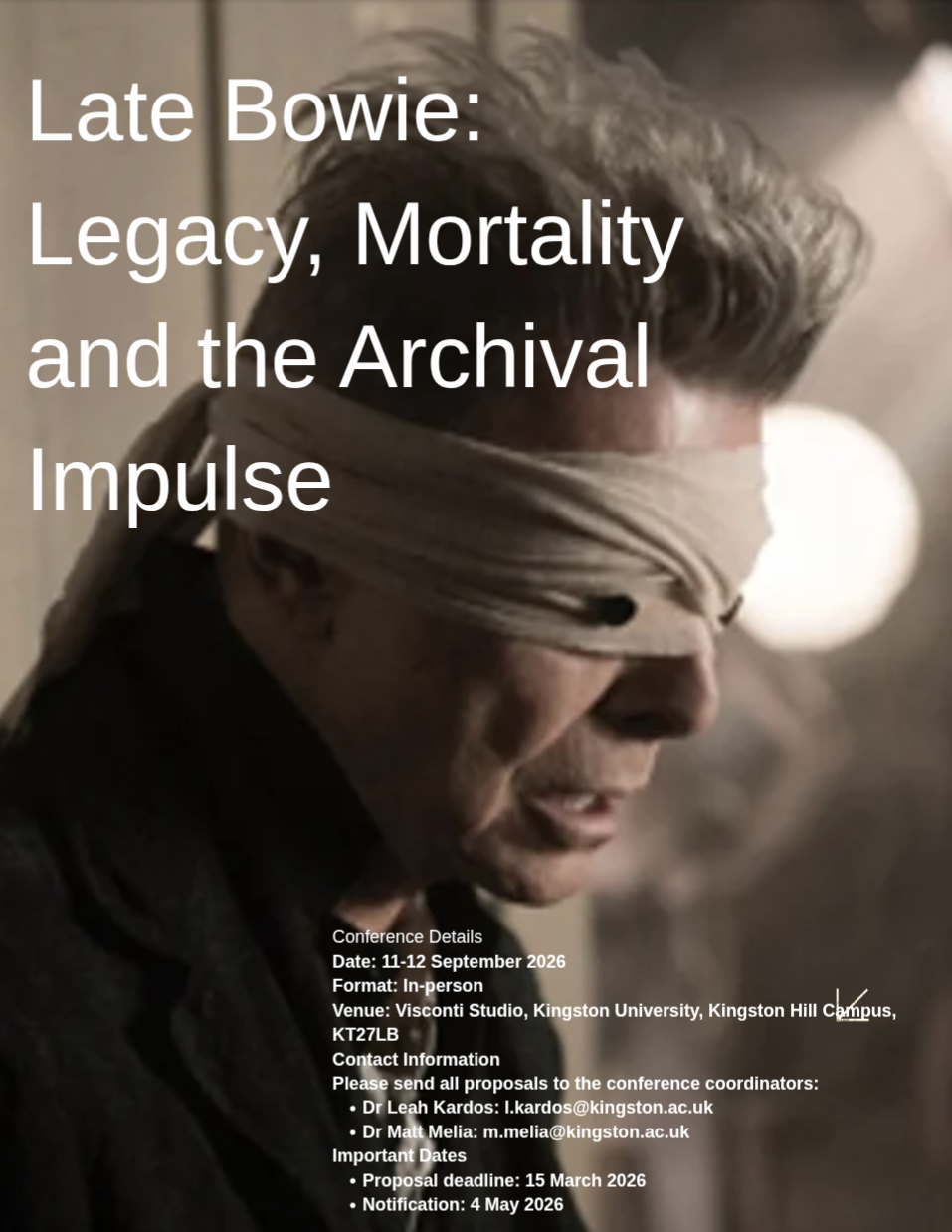 This conference, which takes place in the Visconti Studio at Kingston University, invites proposals which offer a range of critical and creative responses to Bowie’s late-period work: his musical outputs; self-curation of persona and image, collaborations, media presence, death and posthumous reshaping of legacy in contemporary culture. The conference welcomes not only academic papers (from across all disciplines) but the work of creative practitioners whose work engages with Bowie’s late-period work and especially this final period.