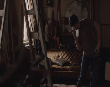 What this particular rendering of the shot brings out is, once again within our blog strand, a somewhat performative quality (see, for example, our examinations of Robert Lindsay in G.B.H.(Channel 4, 1991) and Charles Dance in Game of Thrones (HBO, 2011-present)): Driver’s character at the start here is very much loosening up like one might do before a performance, be it for theatre or sport. Both of these similes seem apt here, for Driver’s Adam has to manage delivering an answerphone message for a potential blind date; as much a verbal performance as it surely is an excruciating test of endurance, especially for a character who does not fit easily into societal/behavioural norms. The performative aspect of the scene is further developed through the fact that the bulk of the message is delivered by Adam on the stage-like workbench, and that he ends the phone conversation by bending forward, similar to a stage actor’s bow or an athlete’s exhausted slump at the end of their respective performances.